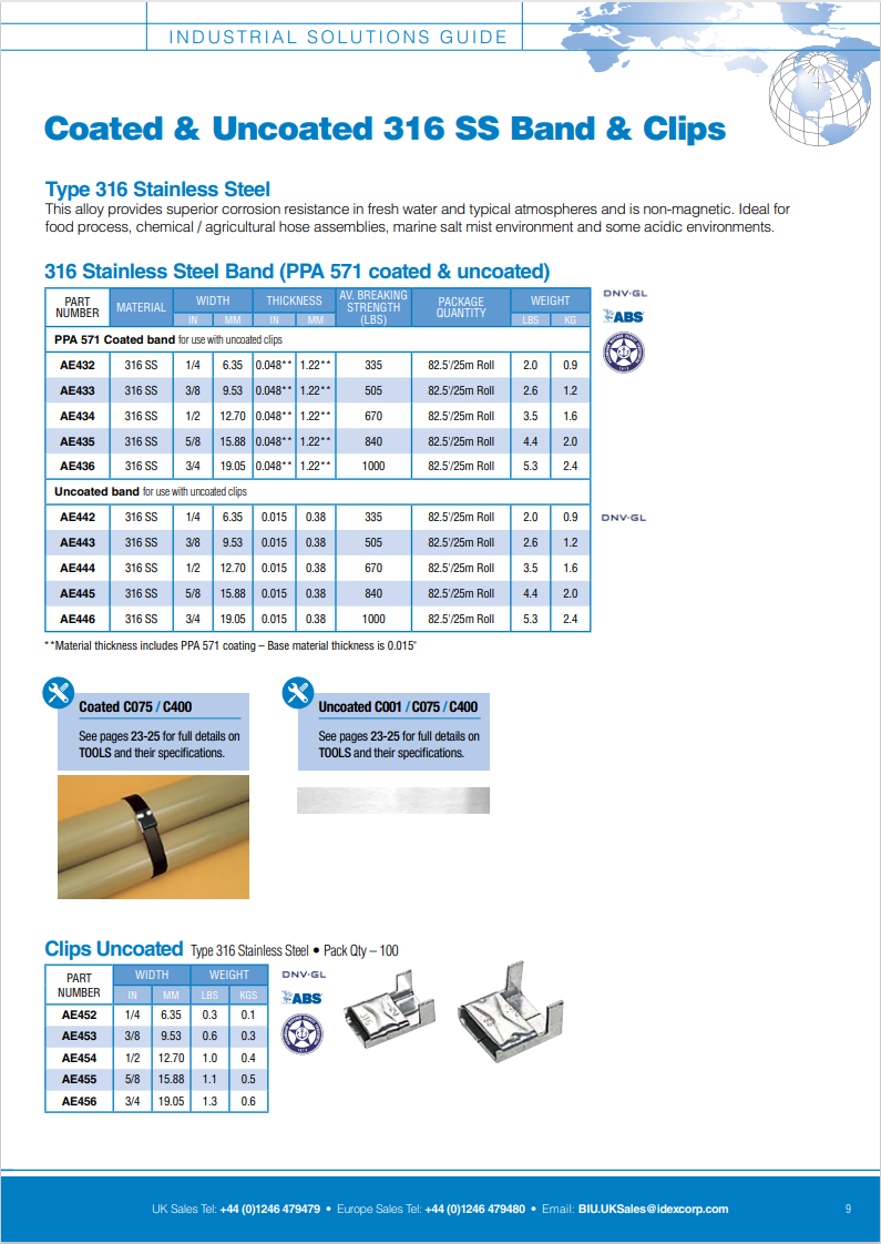 BAND-IT Marine Grade Stainless Steel Band & Clip system is available in 5 widths and provides superior corrosion resistance in fresh water and typical atmospheres and is non-magnetic. Ideal for food process, chemical / agricultural hose assemblies, marine salt mist environment and some acidic environments.