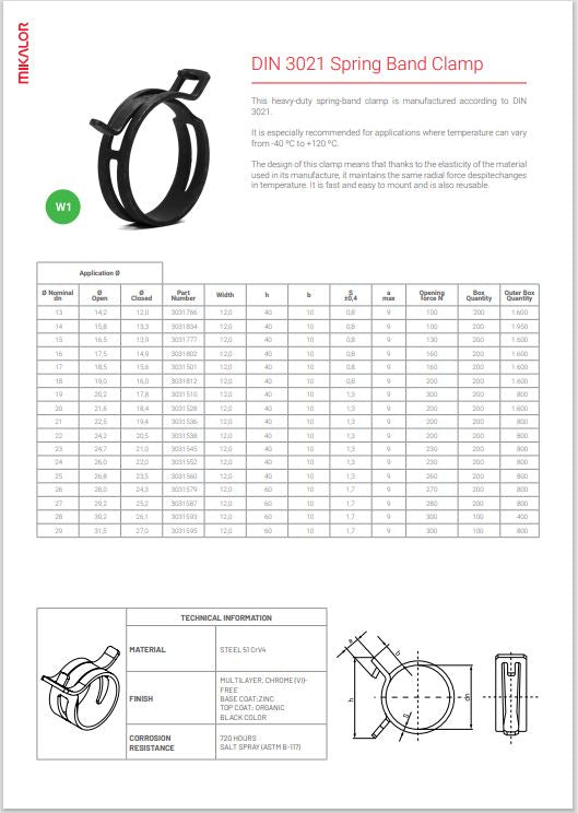 This heavy-duty spring-band clamp is manufactured according to DIN 3021. It is especially recommended for applications where temperature can vary from -40 ºC to +120 ºC. The design of this clamp means that thanks to the elasticity of the material used in its manufacture, it maintains the same radial force despite changes in temperature. It is fast and easy to mount and is also reusable.