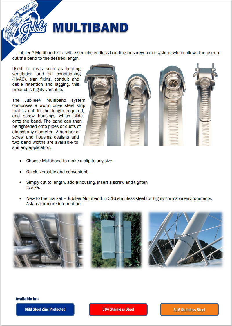The Jubilee® Multiband system comprises a worm drive steel strip that is cut to the length required, and screw housings which slide onto the band. The band can then be tightened onto pipes or ducts of almost any diameter. A number of screw and housing designs and