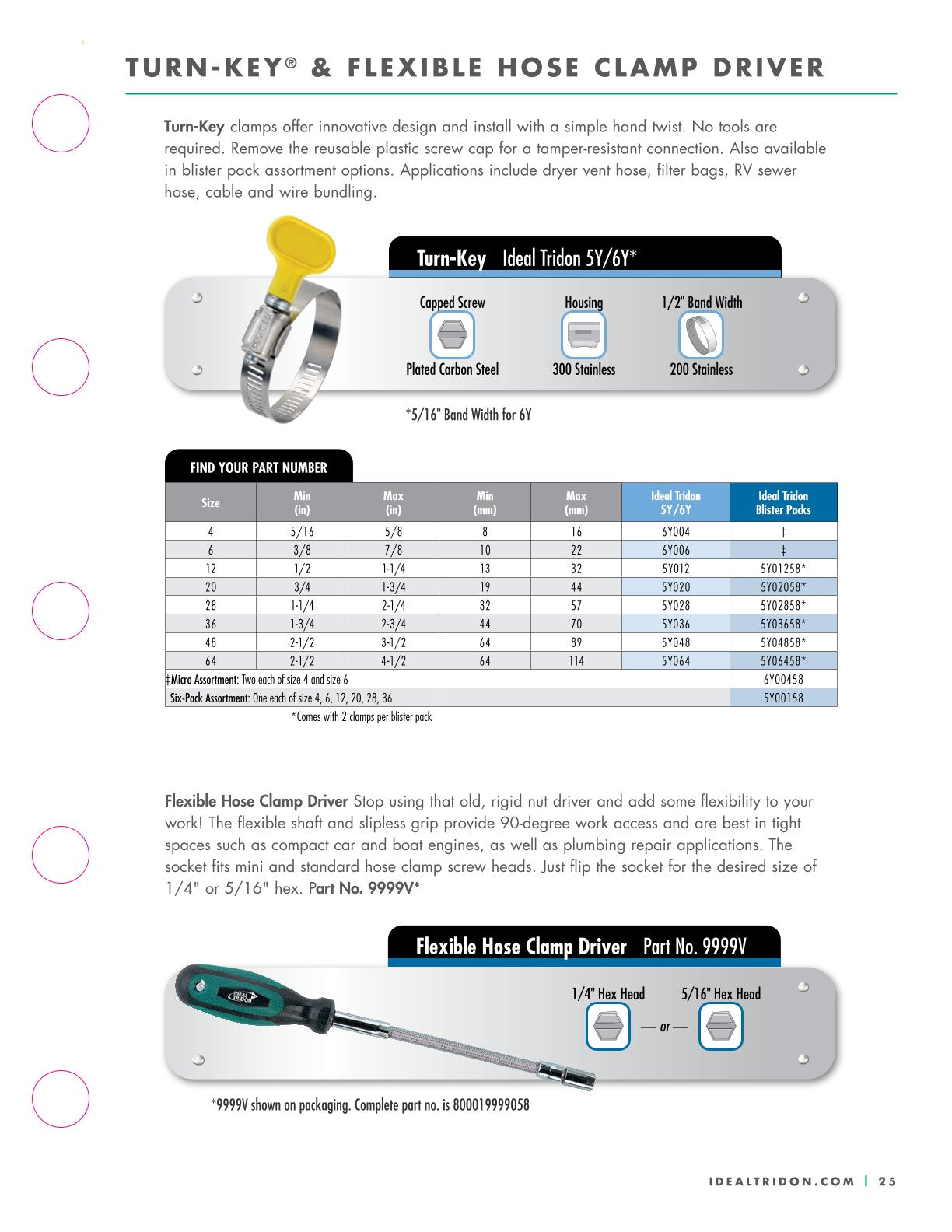 Turn-Key clamps offer innovative design and install with a simple hand twist. No tools are required. Remove the reusable plastic screw cap for a tamper-resistant connection. Also available in blister pack assortment options. Applications include dryer vent hose, filter bags, RV sewer hose, cable and wire bundling.