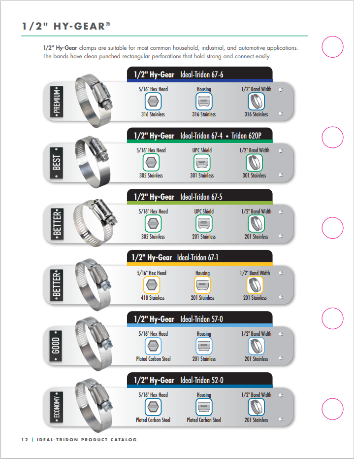 1/2" (12.7mm) wide Hy-Gear worm gear hose clamps are suitable for most common household, industrial, and automotive applications. The bands have clean punched rectangular perforations that hold strong and connect easily. The 67-4 series is made from 300 Stainless Steel offering very good corrosion resistant properties
