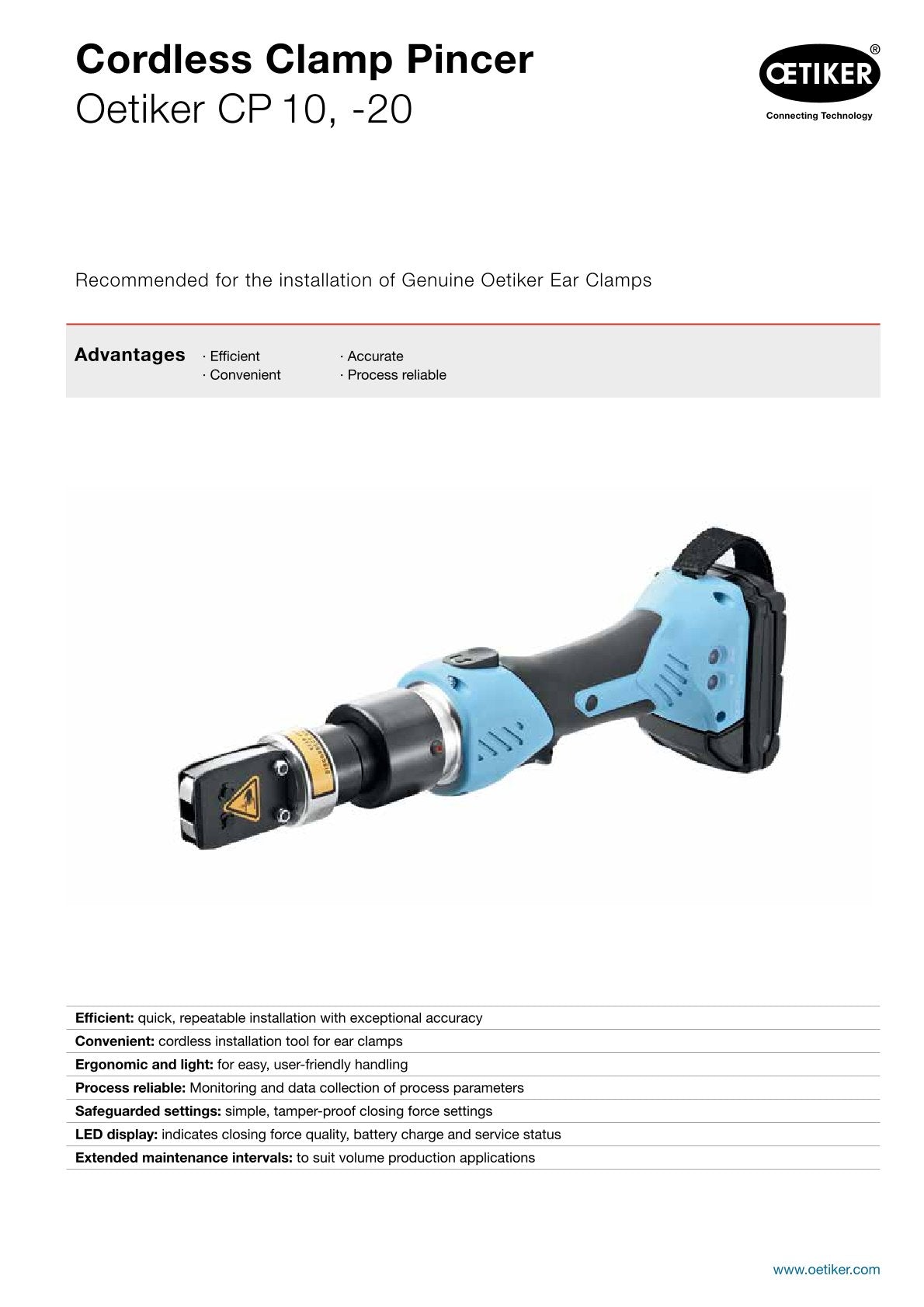 Cordless CP 10 and CP 20 pincers are ideal alternatives to pneumatic tools where installation flexibility is of paramount importance. the tools guarantee a quick and effortless installation of Oetiker ear clamp models with high accuracy and excellent manoeuvrability in tight spaces.