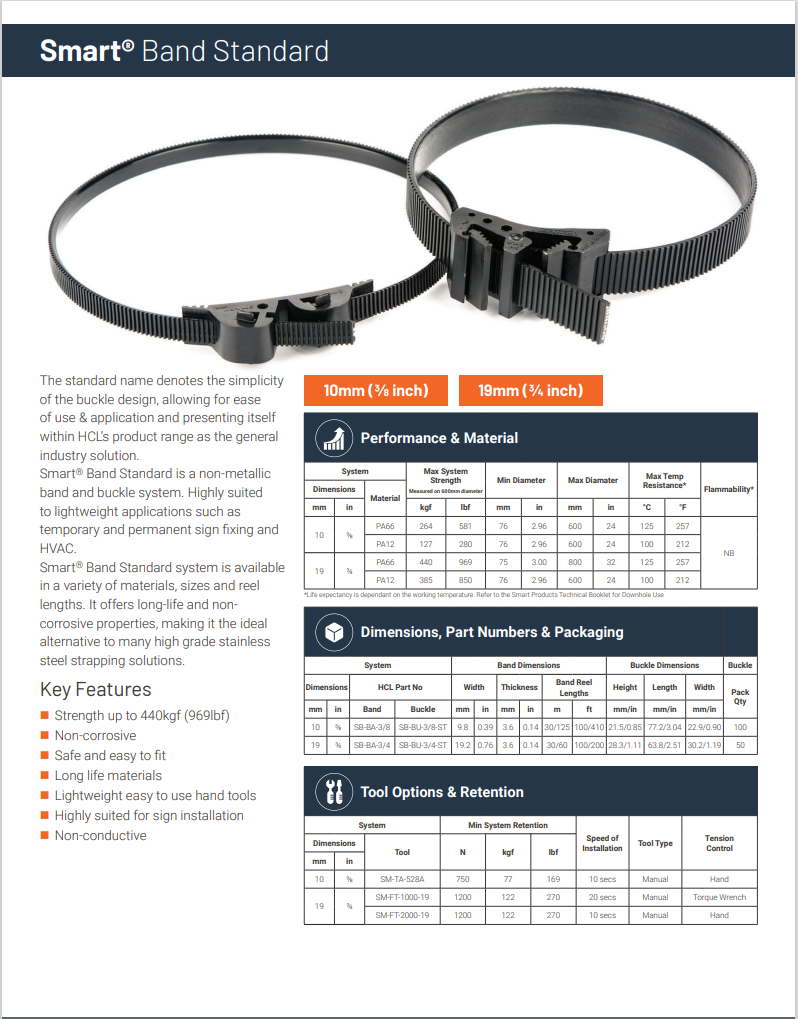 Smart® Band is a non-metallic band and buckle system. Highly suited to a variety of Banding applications, Non-Corrosive, Non-Conductive & Non-Magnetic. The Smart Band is available in 4 widths and several reel lengths and is capable of withstanding extreme loads making it the strongest non-metallic clamping system in the world. Strength figures are dependent on Buckle Choice (see brochure for more information) HCL also offers a number of installation tools to provide safe & simple installation.