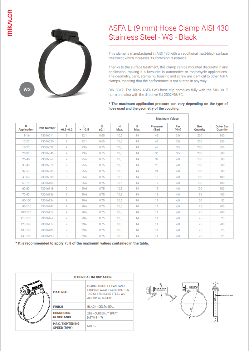 This 3/8 inch (9.0mm) wide clamp is manufactured by Mikalor in AISI 430 with an additional matt-black surface treatment which increases its corrosion resistance. Thanks to the surface treatment this clamp can be mounted discreetly in any application, making it a favourite in automotive or motorcycle applications. The geometry, band, stamping, housing and screw are identical to other ASFA clamps, meaning that the performance is not altered in any way. DIN 3017. The Black ASFA LW3 hose clip complies fully with the DIN 3017 norm and also with the directive EU 2002/95/EC.