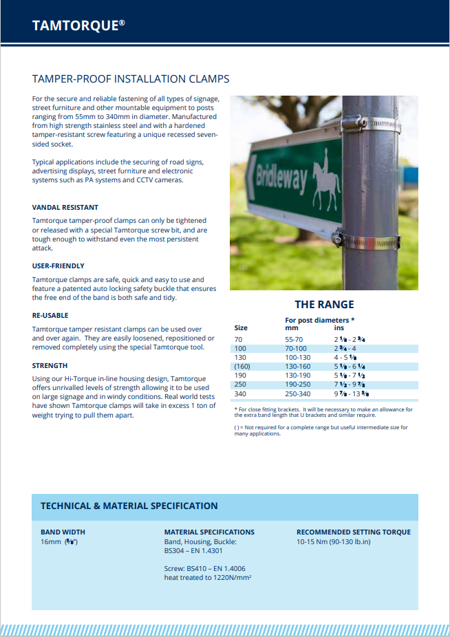 JCS's 5/8 inch wide Perforated Worm Gear Hose clamps are Tamper-resistant installation clamps for the secure and reliable fastening of all types of signage, street furniture and other mountable equipment to posts ranging from 55mm to 340mm in diameter. Manufactured from high strength stainless steel and with a hardened tamper-resistant screw featuring a unique recessed seven-sided socket. Typical applications include the securing of road signs, advertising displays, street furniture and electronic systems such as PA systems and CCTV cameras.