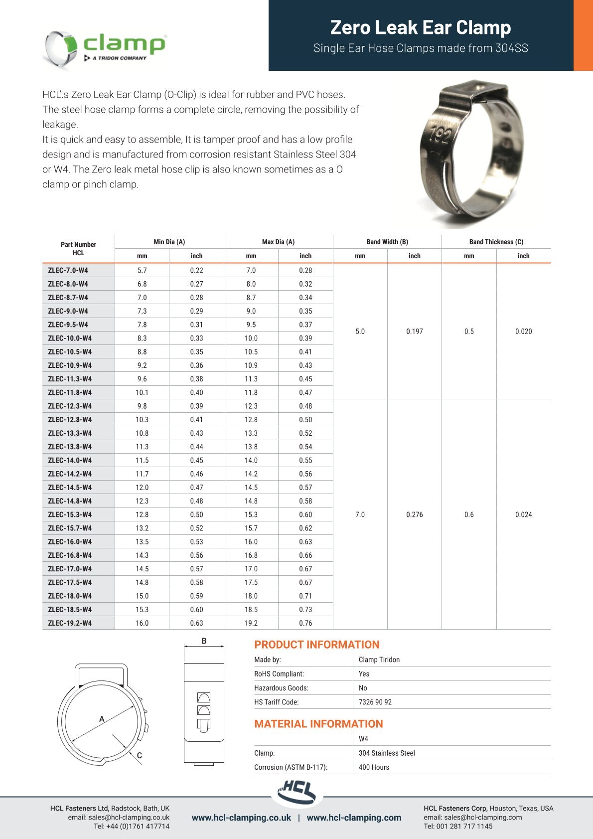 Tridon's Zero Leak Ear clamp (O-Clip) is ideal for rubber and PVC hoses. The steel hose clamp forms a complete circle, removing the possibility of leakage. It is quick and easy to assemble, has a low profile design and is manufactured from corrosion resistant Stainless Steel 304 or W4. The Zero leak metal hose clip is also known sometimes as a low profile hose clamp.