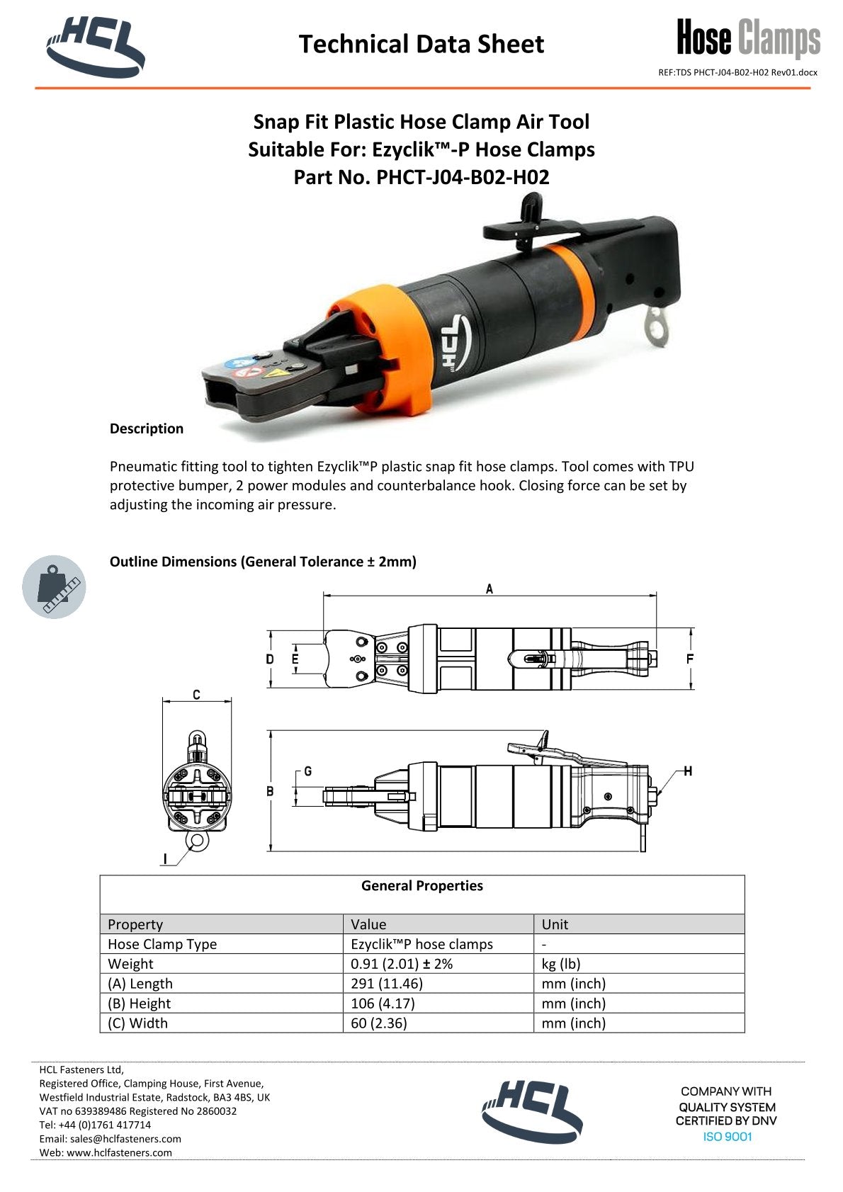 HCL Ezyclik-P Hose Clamp Air Tool - Fast & Audibly Confirmed Installation!. Ensure every connection is perfect with the HCL Ezyclik-P Hose Clamp Air Pneumatic Installation Tool, part number PHCT-J04-B02-H01. This specialized tool provides a fast, powerful, and audibly confirmed crimp, making the installation of Ezyclik-P clamps a simple, precise, and highly efficient process.