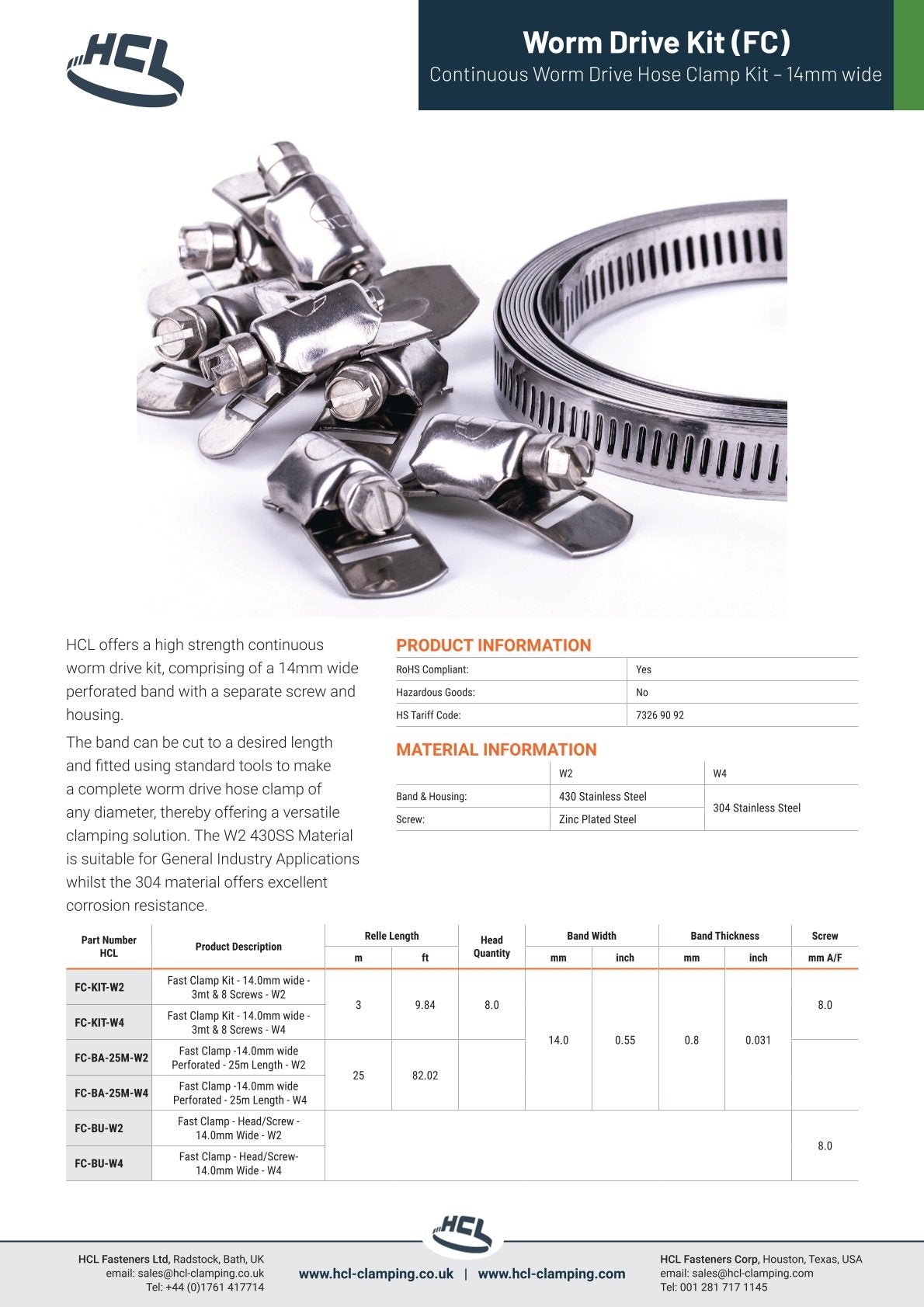 HCL offers a high strength continuous worm drive kit, comprising of a 14mm wide perforated band with a separate screw and housing. The band can be cut to a desired length and fitted using standard tools to make a complete worm drive hose clamp of any diameter, thereby offering a versatile clamping solution. The W2 430SS Material is suitable for General applications